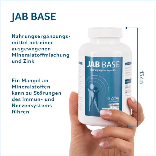 JAB BASE enthält sorgfältig aufeinander abgestimmte Mineralstoffe und Zink. Mineralstoffe sind essenziell, das heißt lebensnotwendige Nährstoffe, die wir über pflanzliche und tierische Nahrung zu uns nehmen müssen. Sie haben vielfältige Funktionen im menschlichen Körper, dienen zum Beispiel als Signalüberträger, als Bausteine für Knochen, Zähne und Proteine, sind für die Zellteilung notwendig oder sind an der Aufrechterhaltung des Säure-Base-Gleichgewichts im Körper beteiligt. Ein Mangel an Mineralstoffen kann zu Störungen des Immun- und Nervensystems führen und die enzymatische Regulation der Stoffwechselvorgänge im Körper aus ihrem sensiblen Gleichgewicht bringen.